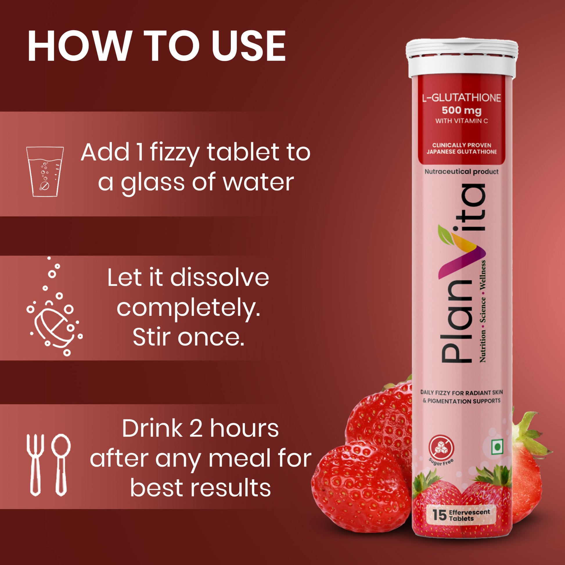 Dissolve one effervescent tablet in a glass of water and consume it daily, preferably on an empty stomach. Regular intake helps in reducing pigmentation and promoting a radiant, glowing complexion.